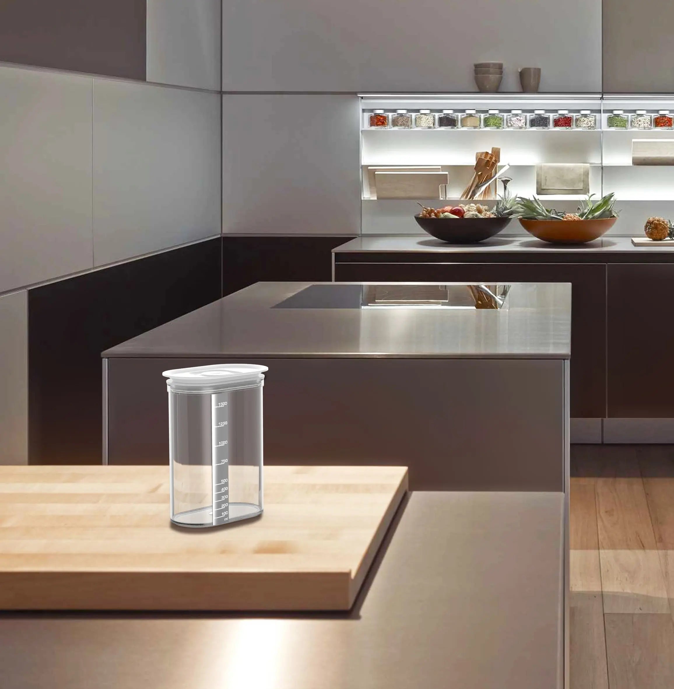 | Plastic Oval airtight and watertight container decorated with an elegant chromed graduated scale.Suitable for storing any type of food /Capacity 1.550L / Dishwasher safe / Made in Italy./BPA free/ Crystal polystyrene and silicone |